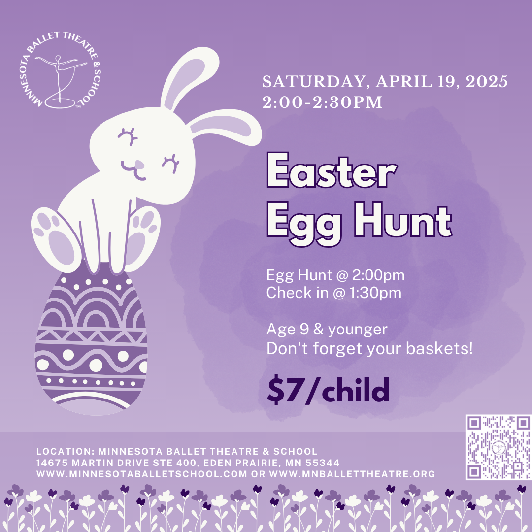 Minnesota Ballet Theatre & School invites families to join us for our Annual Easter Egg Hunt — a cheerful outdoor event perfect for children ages 0–9. Kids will have fun searching for colorful eggs filled with candy and prizes, with hunts divided by age group for safety and enjoyment.