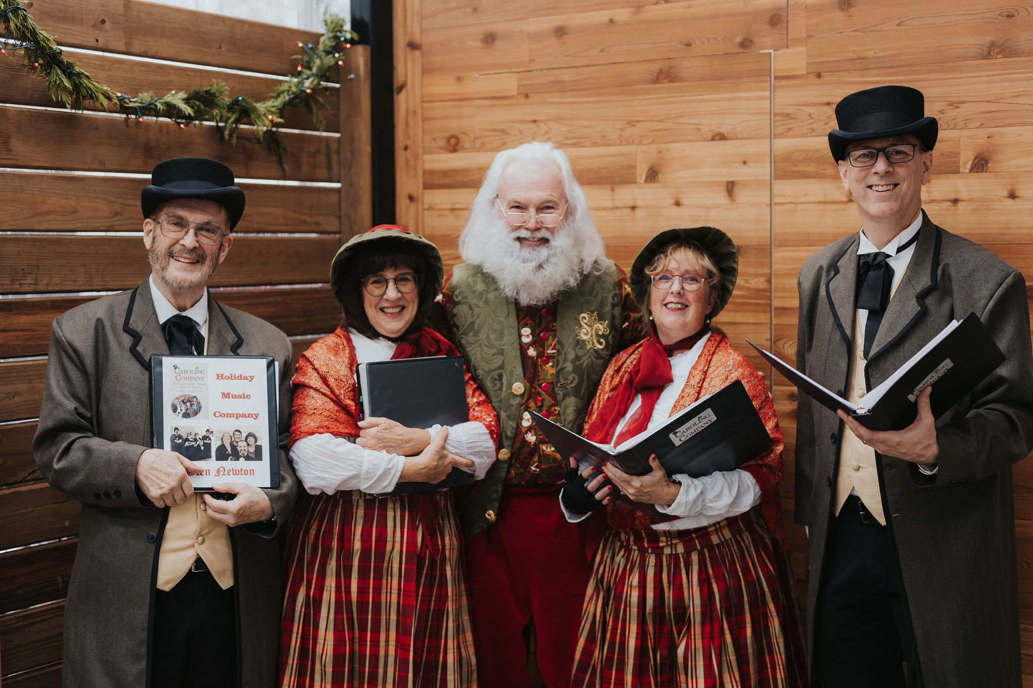 Five holiday carolers dressed in Victorian costumes holding sheet music.