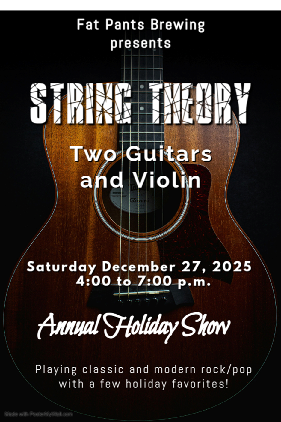 String Theory is hitting the taproom on Saturday, December 27th from 4–7 PM with their Annual Holiday Show! They’re part of Wondercure, a local favorite that’s played with us before, and they’ll be bringing a mix of classic and modern rock/pop with a few holiday hits! Grab a beer and settle in for a great evening of live music!
